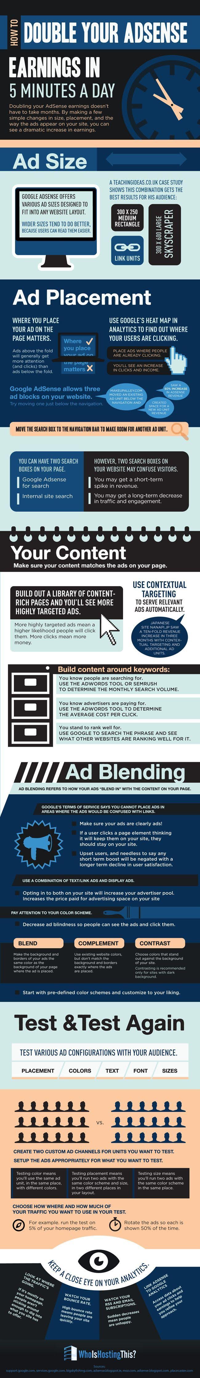 How To Increase Your Site's AdSense Earnings in 5 Minutes a Day - #infographic Irfan Ahmad 4/29/2014 09:09:00 AM Doubling your AdSense earnings doesn’t have to take months. By making a few simple changes in size, placement, and the way the ads appear on your site, you can see a dramatic increase in earnings. infographic courtesy of whoishostingthis. Tags: Blogging info-graphics Facebook Twitter