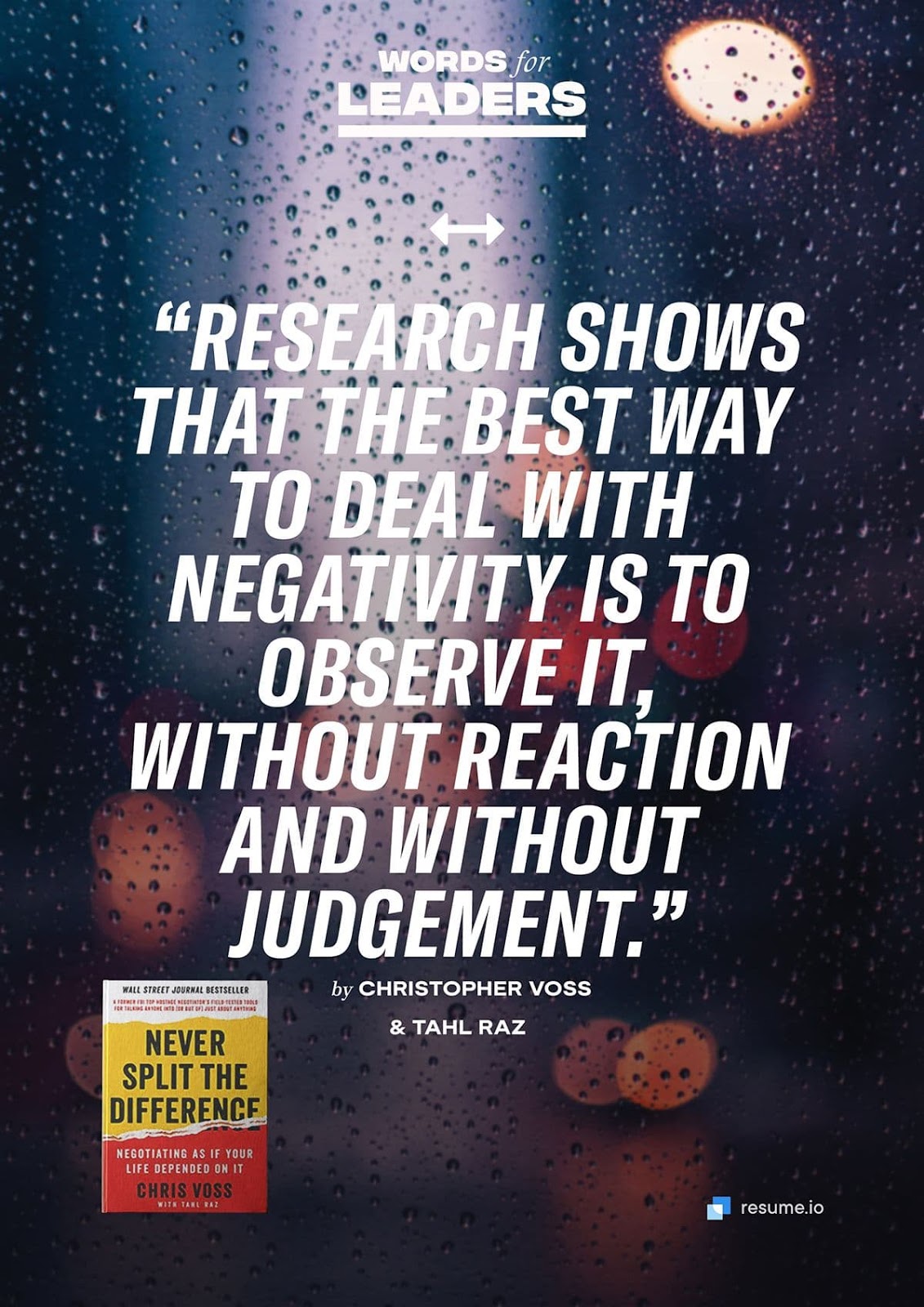 “Research shows that the best way to deal with negativity is to observe it, without reaction and without judgement. Then consciously label each negative feeling and replace it with positive, compassionate, and solution – based thoughts”
