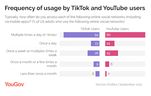 The results showed that on YouTube 60 percent of the users came on the platform twice a day, while on TikTok 54 percent did. Among this figure some even claimed to have come on the app up to ten times a day. 18 and 19 percent users for both TikTok and YouTube respectively stated to have come online once or multiple times a week. The least numbers were 6 percent on TikTok and 2 on YouTube which said they popped on the app less than once a month.