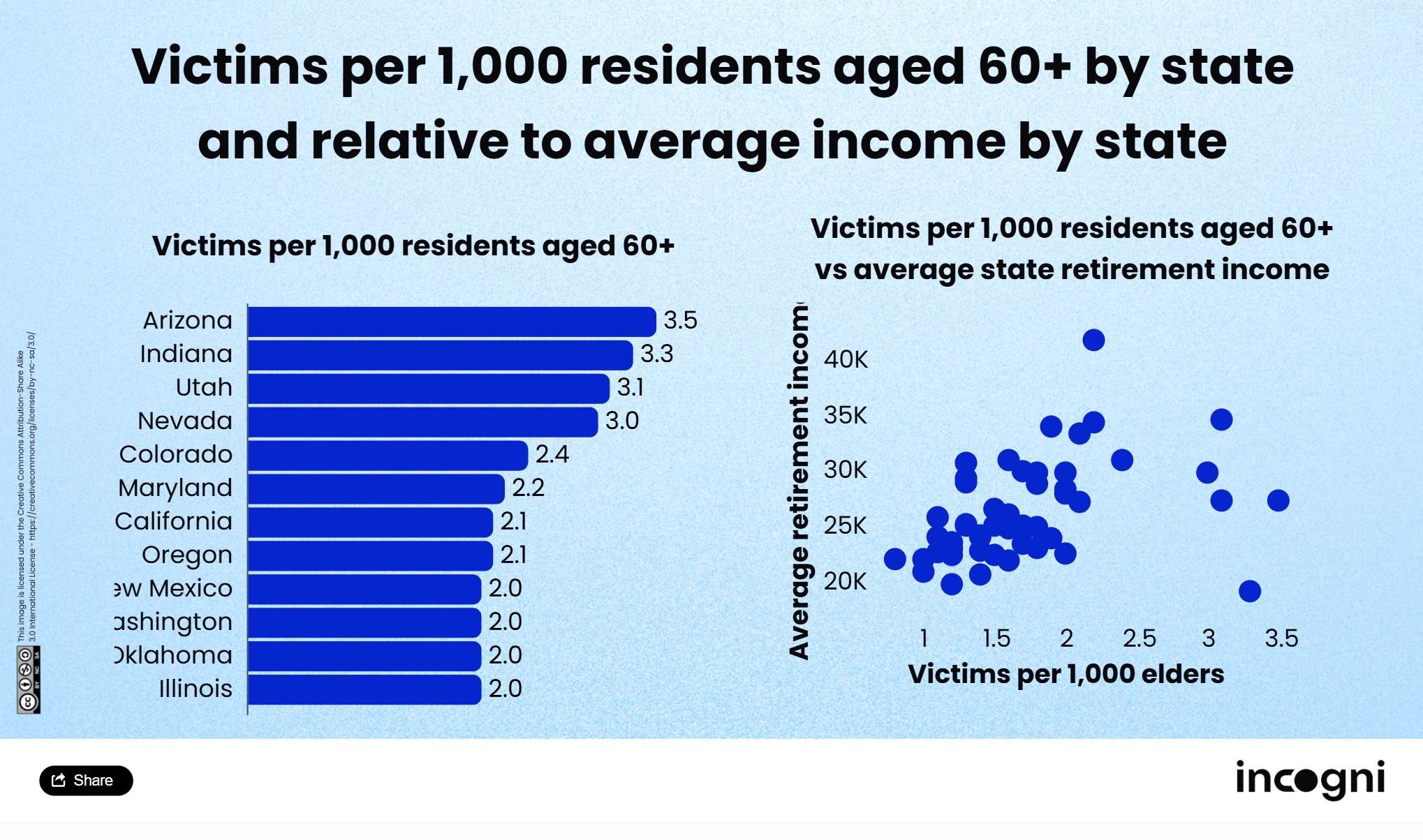 Incogni researchers also cross-checked the total number of complaints versus the population of individuals aged 60+ years for each state to understand better the ratios of elders living in each state to those affected.