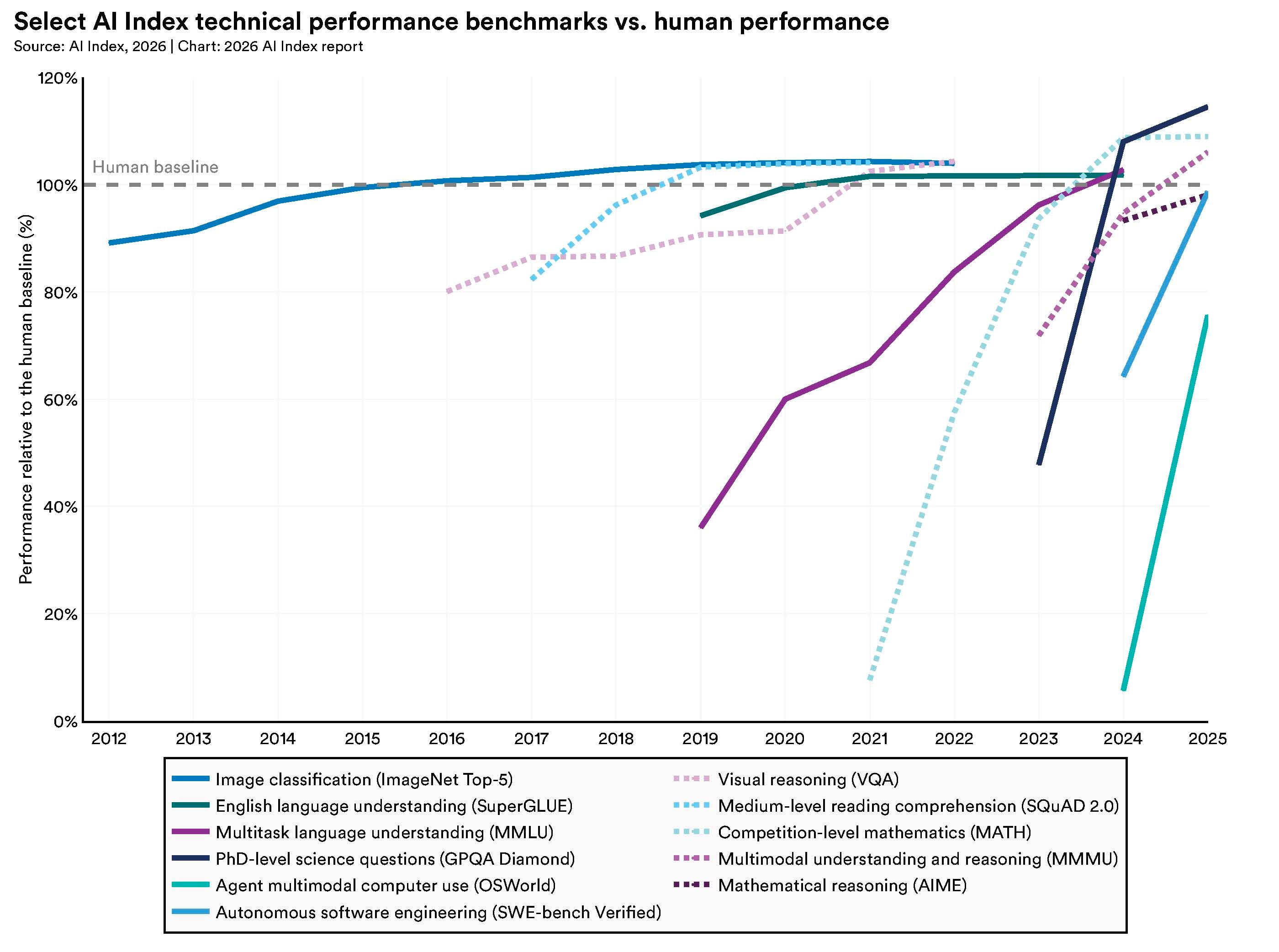 AI continues to expand its capabilities, hitting higher scores on benchmarks across types. But not all capabilities are evenly distributed. Frontier models now meet or exceed human capabilities on items like PhD-level science questions, multimodal reasoning, and competition mathematics. Other areas that had been performing poorly saw huge growth. For example, the success rate of agents handling real-world tasks improved from 20% in 2025 to 77.3% today, according to Terminal-Bench, while AI agents handling cybersecurity issues solved problems 93% of the time compared to 15% in 2024.